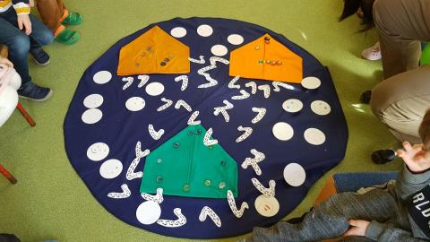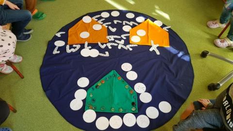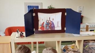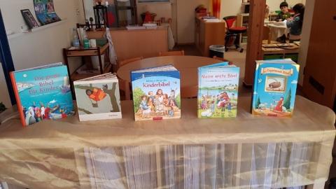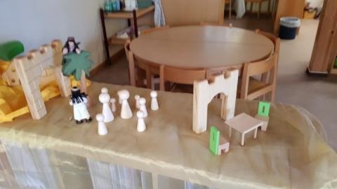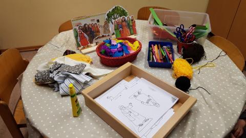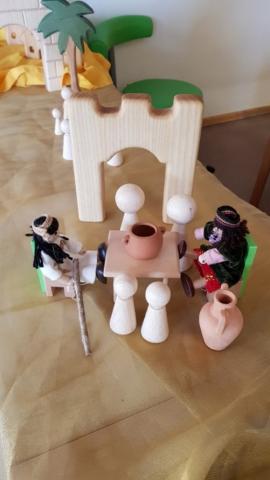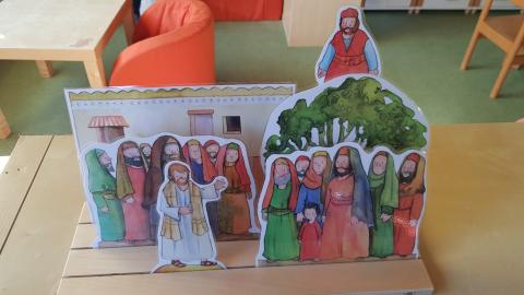 Verschiedene Kinderbibeln warteten nur darauf entdeckt zu werden. Wir lasen aus der Buchreihe „Was uns die Bibel erzählt“ von Kees de Kort die Geschichte von Zachäus und legten ein dynamisches Bodenbild dazu. Mit Hilfe von Figuren spielten wir die Geschichte von Zachäus in der Erzählschiene nach und in der Figurenwerkstatt stellten wir unsere eigenen Figuren her.