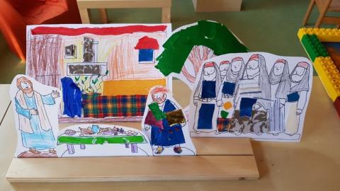 Wir erzählten die biblische Geschichte mit dem Kamishibai Erzähltheater und spielten sie mit Hilfe von Figuren nach. Im Morgenkreis unterhielten wir uns darüber, was die Menschen aus Jericho über Zachäus am Anfang und am Ende dachten und wie es wohl Zachäus ging. Wir malten traurige, wütende und glückliche Gesichter, die diese Gefühle verdeutlichen sollten.